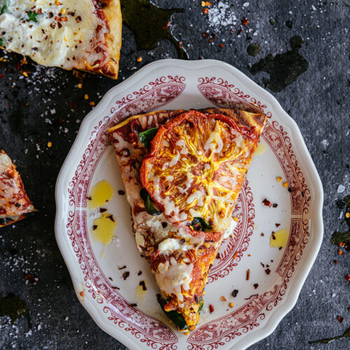 Over the years, I’ve embarked on a quest to perfect my own rendition of the Margarita pizza. While I stay true to the traditional trio of tomatoes, Buffalo mozzarella, and basil, I’ve added my own twist to elevate the flavors. Roasting the tomatoes in the oven imparts a rich, caramelized sweetness, and using burrata instead of Buffalo mozzarella brings a creamy, indulgent texture to each bite. Grilling the crust on both sides before layering on the toppings and finishing it in a wood-fired oven or a quality pizza oven adds a delightful smokiness and irresistible char to the pizza.