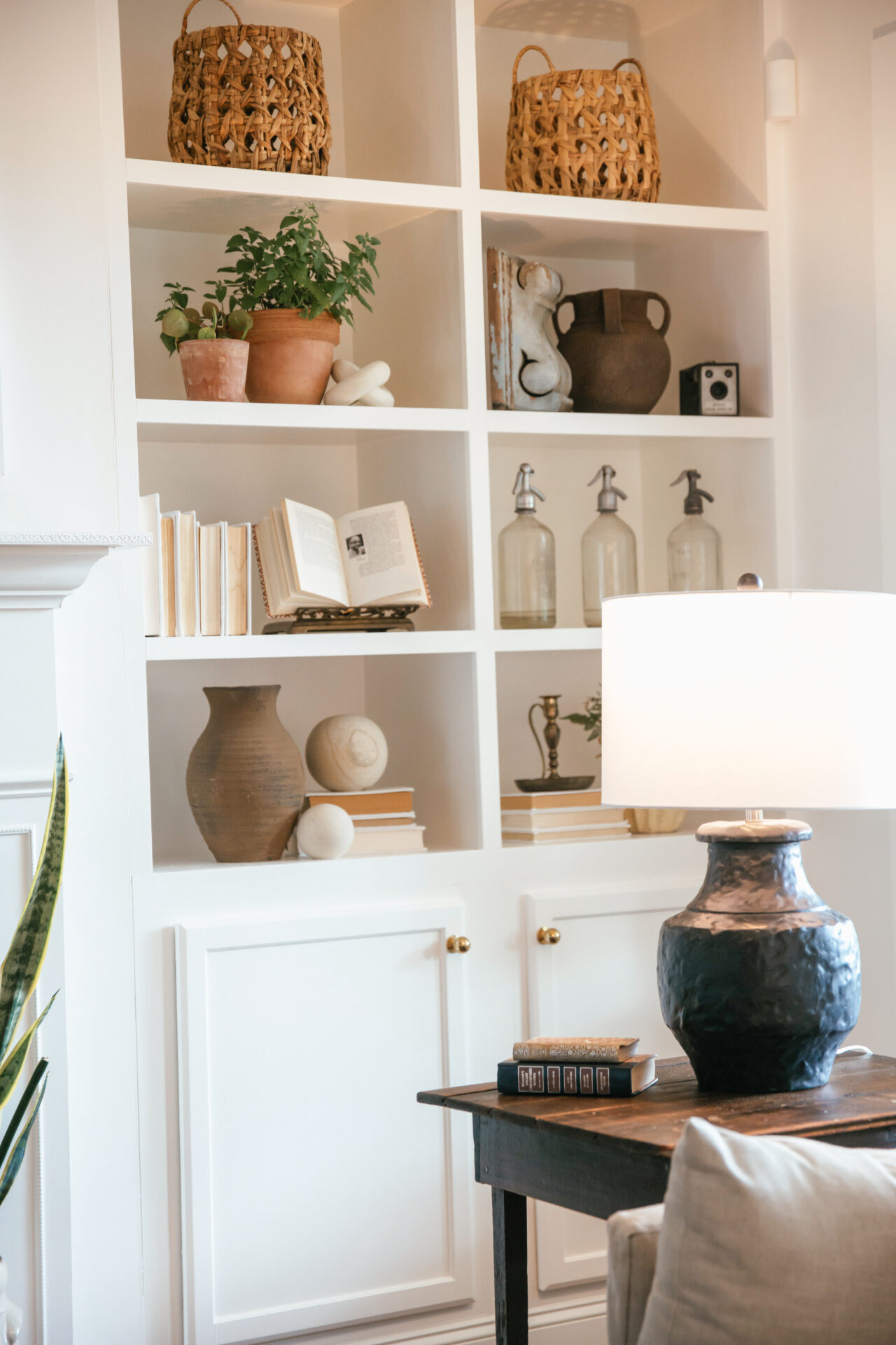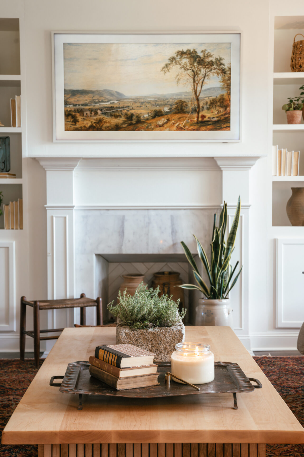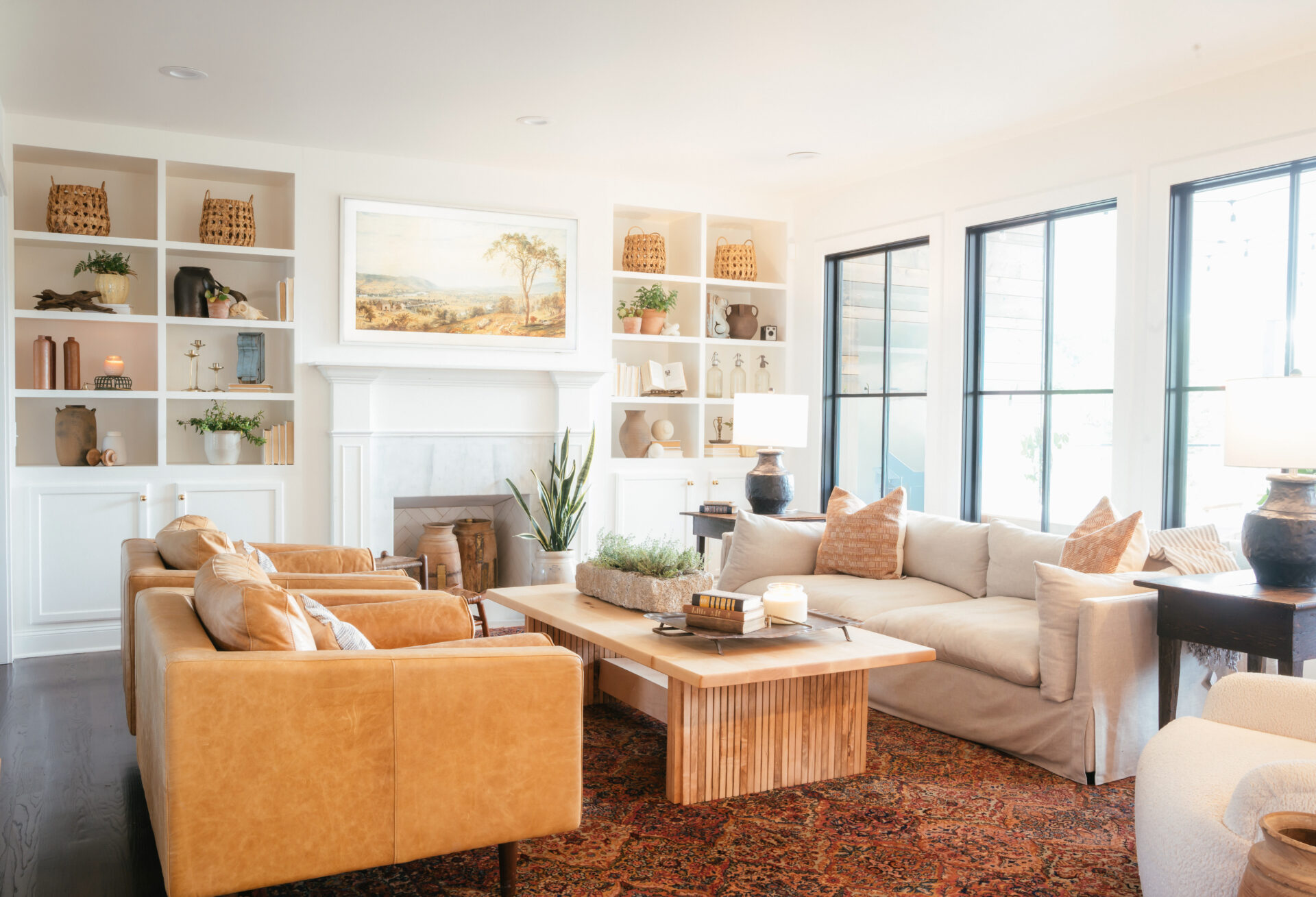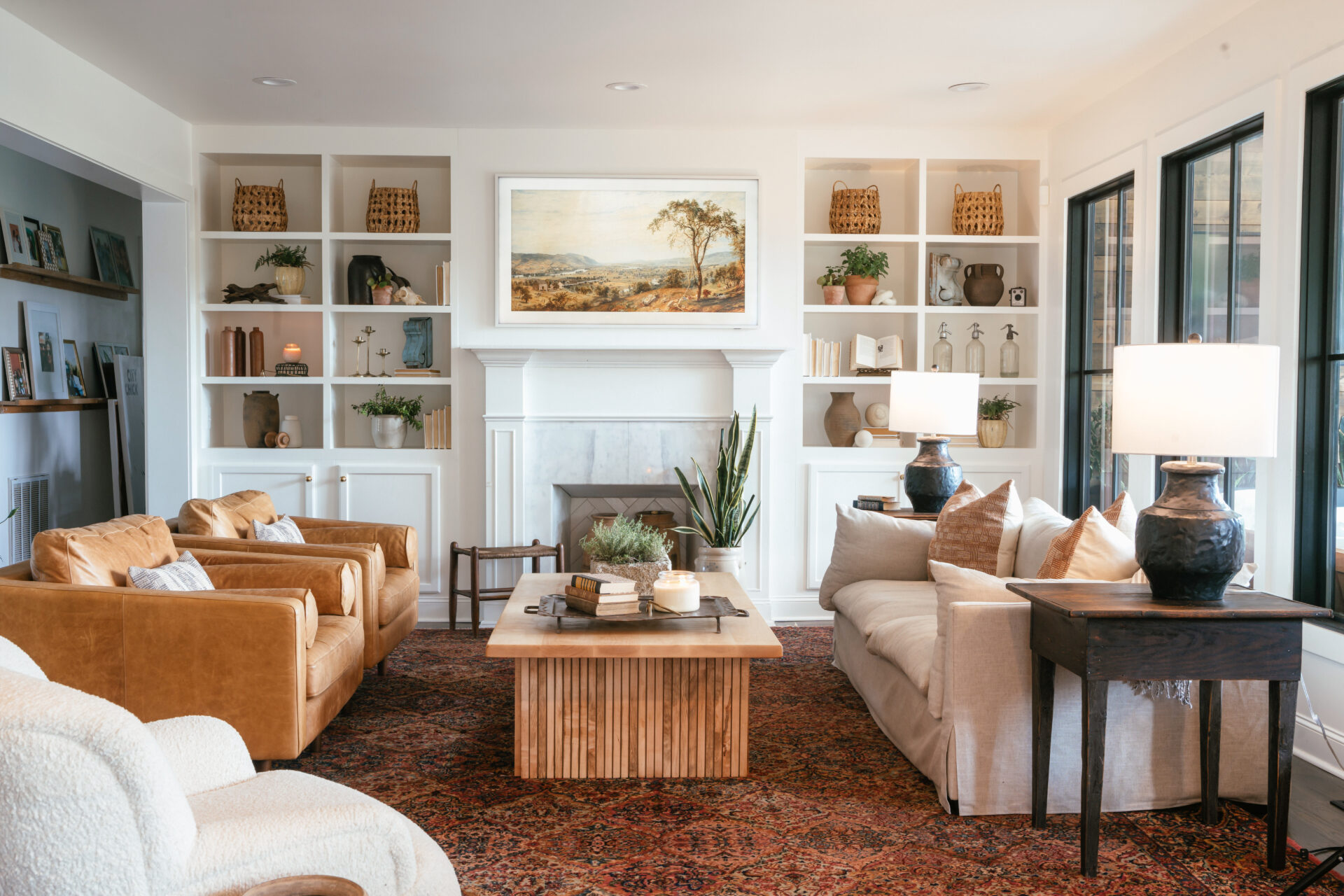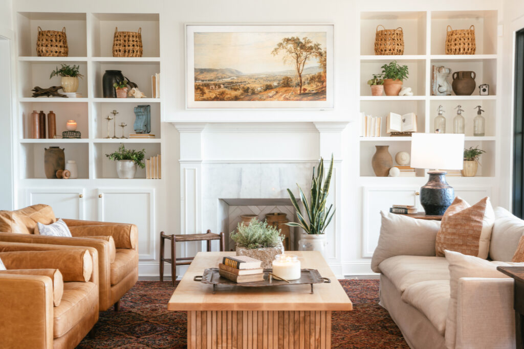 New custom-built cabinetry, updated millwork, and streamlined finishes introduced quiet luxury, while warm materials and thoughtful styling kept the home feeling approachable and lived in. The living room’s built-ins and the reworked fireplace became architectural anchors, unifying the entire space.